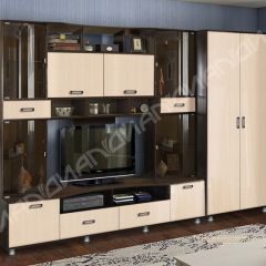 Гостиная Аллегро идеально подойдет для однокомнатной квартиры, ведь в ней есть все необходимые модули: вместительный шкаф для хранения одежды, шкафы-витрины с гнутым стеклом, укомплектованные выдвижными ящиками, тумба под телевизор с ящиками и нишей, открытые полки для сувениров и книг.